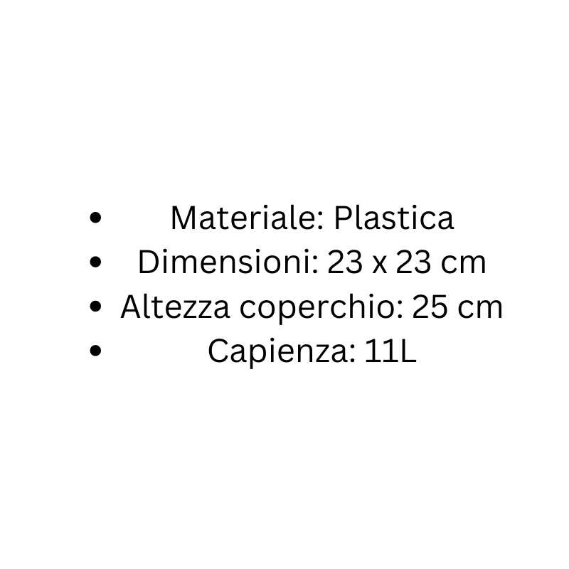 Le dimensioni del Vaso con Coperchio sono di 23×23 centimetri, perfetto per adattarsi a vari spazi e risparmiare spazio. La sua capacità è di 11 litri, offrendo spazio sufficiente per le radici delle piante e garantendo una crescita sana e vigorosa. Inoltre, l’altezza del coperchio è di 25 centimetri, assicurando che le piante abbiano spazio per crescere in verticale senza restrizioni.