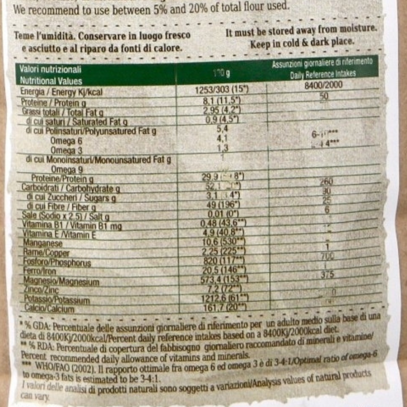La farina è una fonte di proteine completa, perché contiene tutti gli amminoacidi essenziali di cui il nostro corpo ha bisogno per funzionare al meglio. Essa ha un alto contenuto di fibre, che aiutano la digestione e la regolarità intestinale. E anche un alto contenuto di grassi insaturi, che contribuiscono al benessere cardiaco e alla salute delle articolazioni.