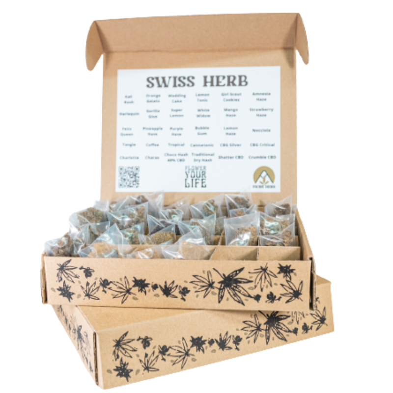 All’interno della Swiss Herb Sample Box, troverete un grammo di ogni varietà di CBD che vendiamo. Questo include fiori di cannabis CBD, hash CBD ed estratti CBD. Ogni campione è accuratamente selezionato e curato per garantire la migliore qualità possibile.