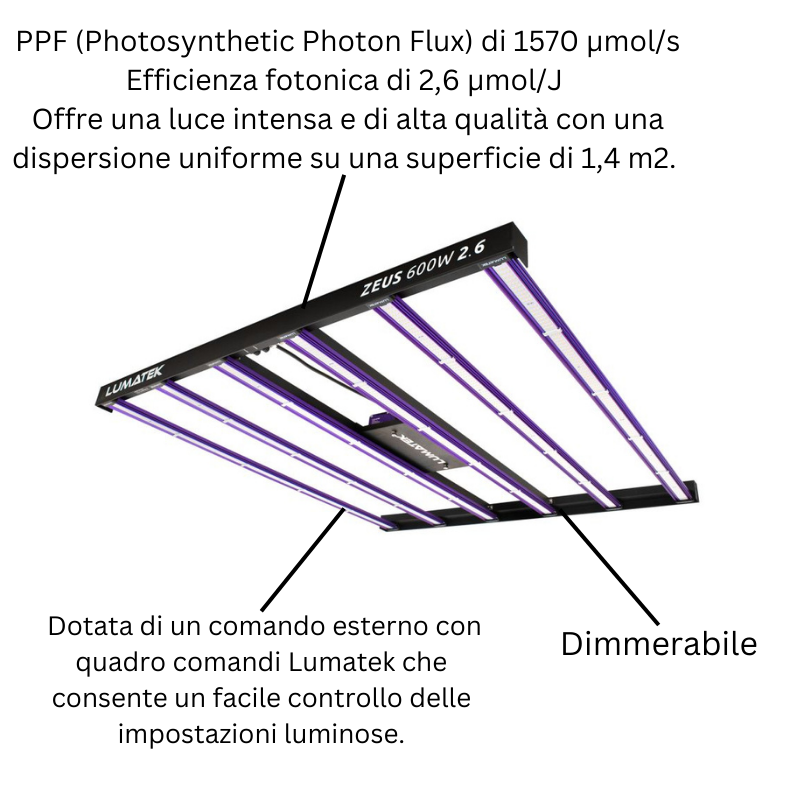 La lampada Lumatek Zeus 600W 2.6 è dotata di un comando esterno con quadro comandi Lumatek che consente un facile controllo delle impostazioni luminose. Questo comando offre diverse opzioni di programmazione, consentendo di creare fotoperiodi personalizzati e simulare condizioni di luce naturale per migliorare il rendimento delle piante.